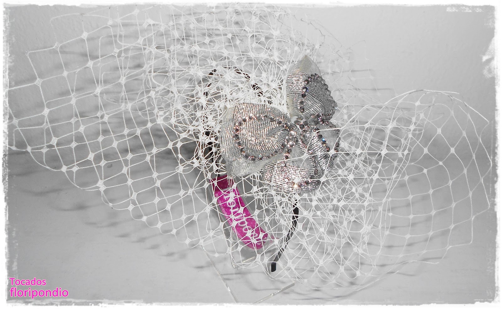 | Diadema de velo blanco adornada con lazo en plata También se monta sobre peinecillo |