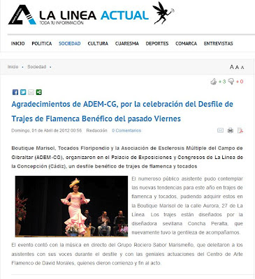 Apariciones en prensa Desfile Benefico ADEM-CG Comentarios y agradecimientos aparecidos en presa sobre el Desfile de Trajes de Flamenca y Tocados a Beneficio de La Asociacíón de Esclerosis Múltiple del Campo de Gibraltar. Europa Sur La Linea Actual Blog ADEM-CG Soledad2012-04-04T11:57:00+00:0004/04/2012| Artículos relacionados Novedades para el 2016 Expoboda Wedding Fashion Day Una tarde en el Polo